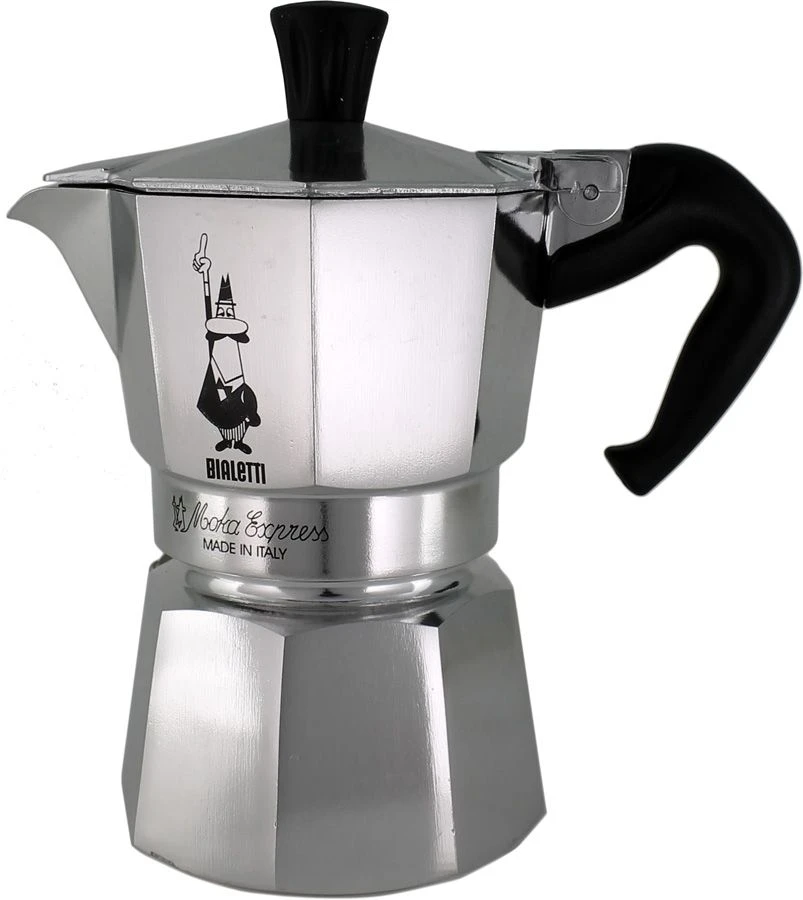 The Moka Express stovetop coffee maker is made of aluminium and works on all stoves except for induction.