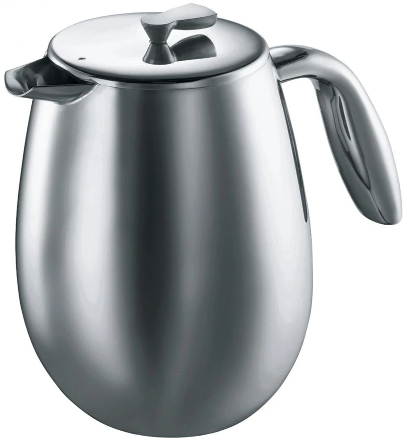 The stainless steel Bodum Columbia double wall French press keeps your coffee hot for longer. Practical, timeless design.