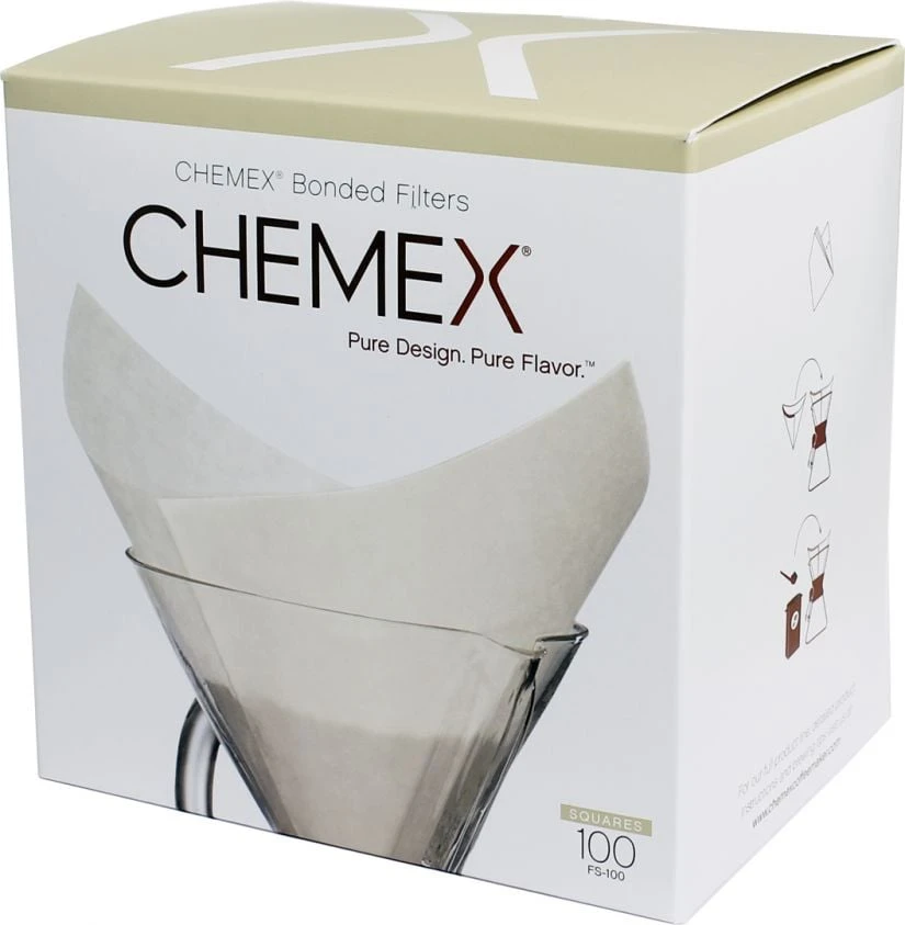 Thick high quality filterpapers for the 6, 8 and 10 cups Chemex coffeemakers. The package contains 100 folded square shaped paper filters. Model number FS-100. Compatible with all Chemex coffee makers, except the smallest 3 cup models CM-1, CM-1C, CM-1GH.