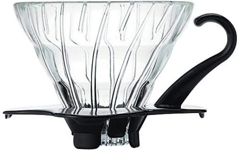 The Hario Glass V60 Coffee Dripper has the same design as all other Hario V60 coffee drippers. It consists of ridges, a large hole in the middle and the V-shape, the only difference is that this dripper is made of glass and has a removable plastic handle.