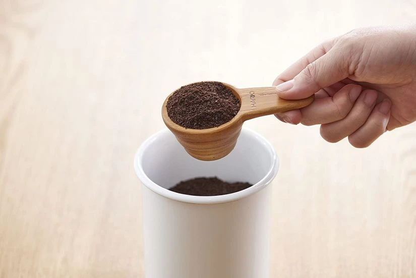 A wooden measuring spoon for ground coffee to complement the Hario V60 series. The teak wood adds a cosy touch.