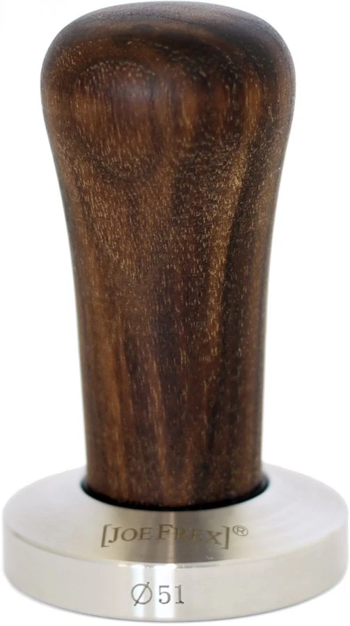 JoeFrex tamper with a flat stainless steel base and a classic walnut handle. The JoeFrex tampers are hand-crafted, and the handles are ergonomically designed to ensure perfect grip and easy manual control.