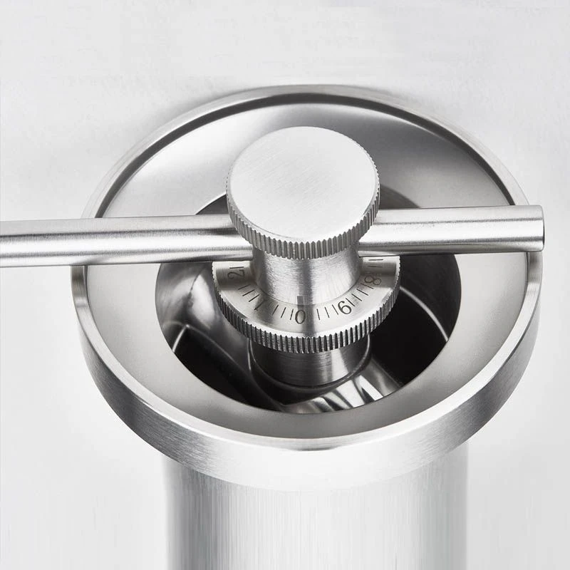 The Kinu M47 Classic coffee grinder has a stepless adjustment with a fine thread (M10 x 0.5) and 50 subdivisions. For each division, you adjust the grinding distance by 0.01 mm.