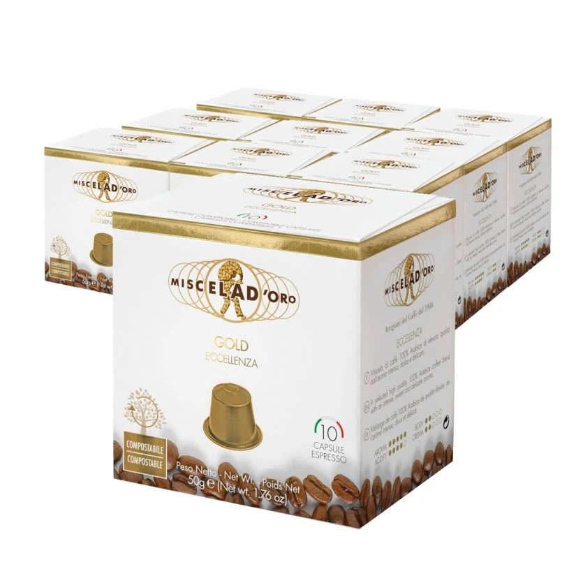 Miscela d’Oro Gold coffee capsules contain Sicilian medium roasted espresso coffee with and intense aroma and a fragrant, sweet and aromatic mouth feel. The blend contains 100 % Arabica from Central and South America. Nespresso compatible capsules.