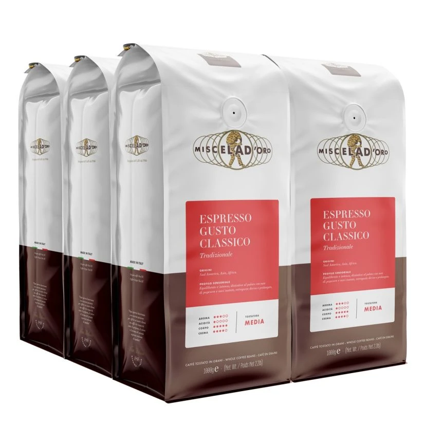 Miscela d’Oro Gusto Classico is a traditional Italian espresso blend with strong and chocolaty taste and a rich character. The coffee gives a generous crema and a long, pleasant aftertaste. This dark roasted Sicilian coffee contains 50 % Arabica from South America and 50 % Robusta from South America and Africa.